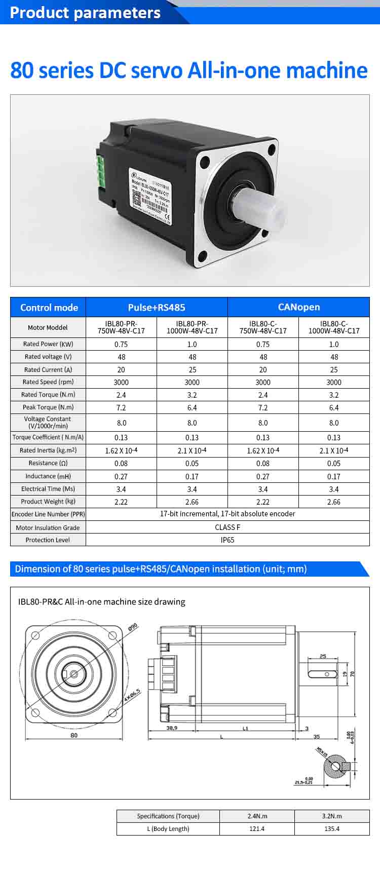 Lichuan 통합 서보 모터 드라이버 펄스/RS485/CANopen 제어 1000W 3.2N.m DC48V 20/25A 3000RPM IP65